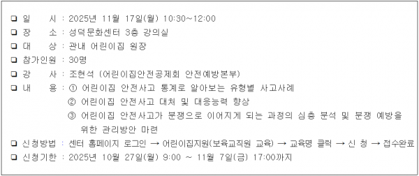 일정 | 2025년 11월 17일 10:30 | 장소 | 성덕문화센터 3층 강의실 |