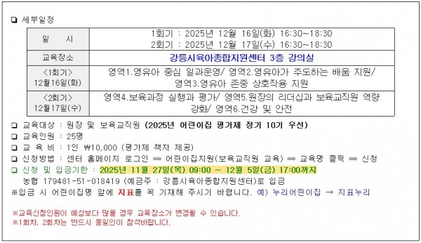 | 일정 | 2025년 12월 16일 09:00 | 장소 | 강릉시육아종합지원센터 |