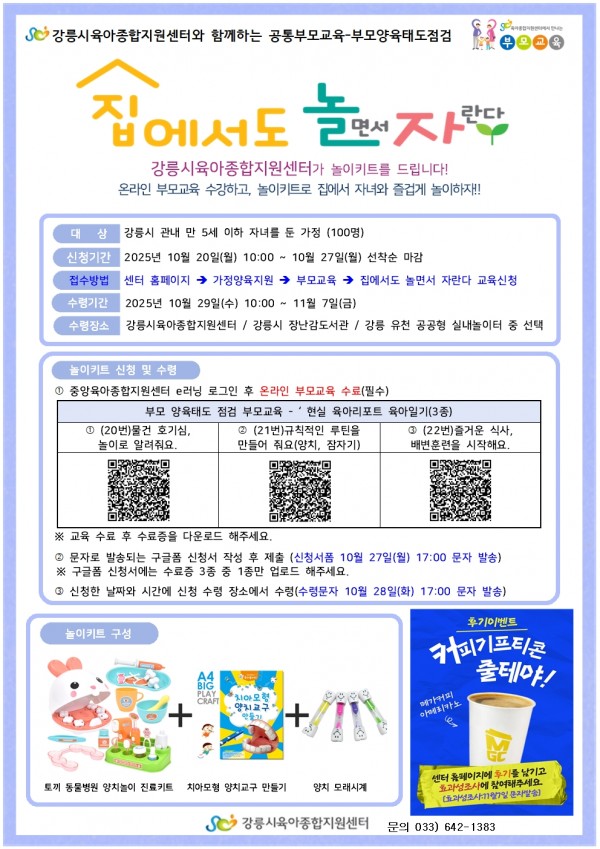 1) 강릉센터 홈페이지 >> 가정양육지원 >> 부모교육 >> 집에서도 놀면서 자란다 교육신청 (교욱신청후 2번 바로 진행)