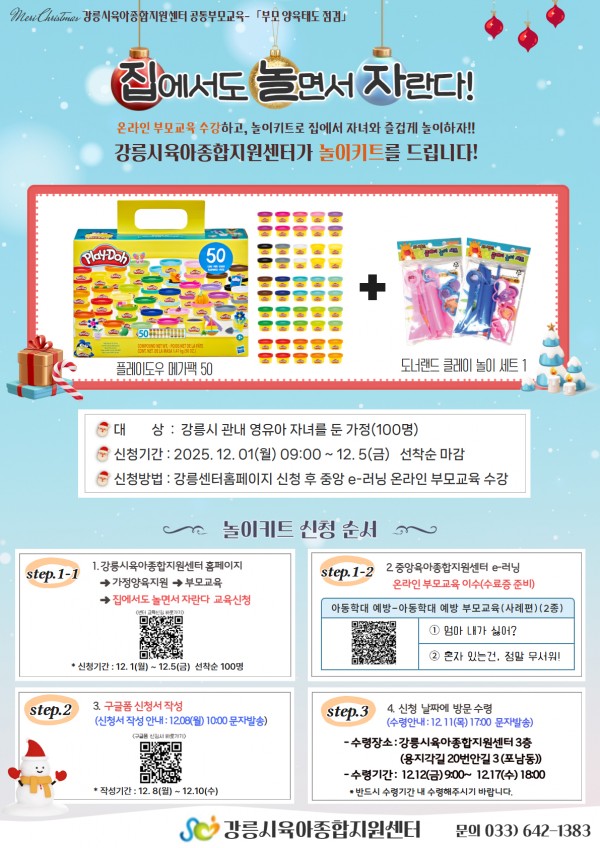 - 여러 가정이 혜택을 받을 수 있도록 참여 취소(또는 수령 포기)하시는 경우 '교육 취소' 또는 '센터로 연락(033-642-1383)' 주시기 바랍니다.