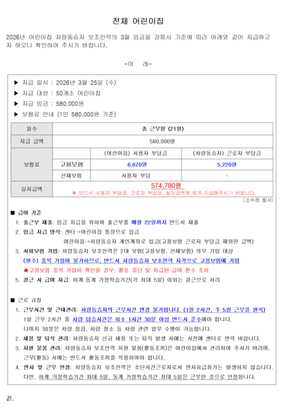 2026년 3월 어린이집 차량동승자 보조인력 임금 지급 안내
