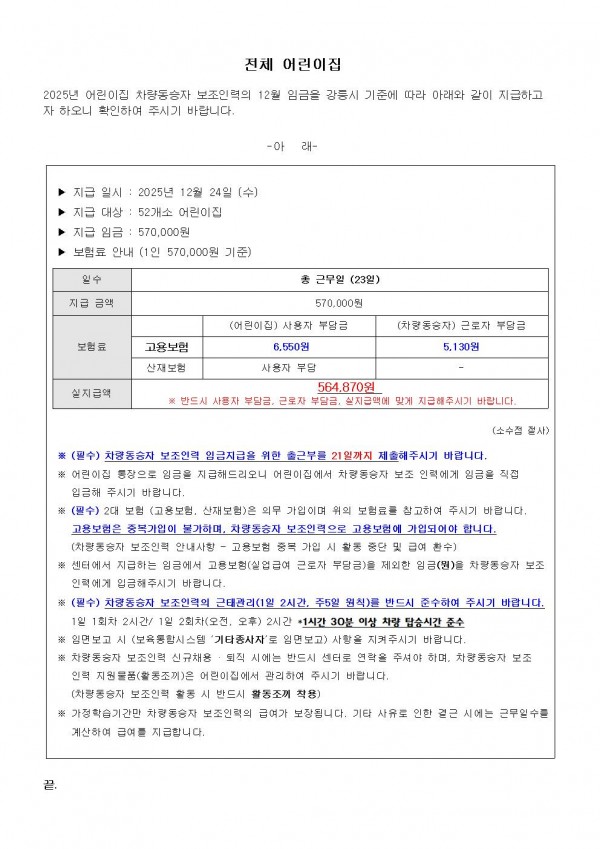 2025년 12월 어린이집 차량동승자 보조인력 임금 지급 안내