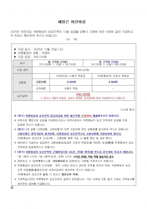 2025년 12월 어린이집 차량동승자 보조인력 임금 지급 안내_해맑은