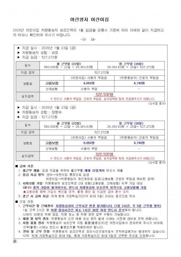 2026년 1월 어린이집 차량동승자 보조인력 임금 지급 안내_어린왕자