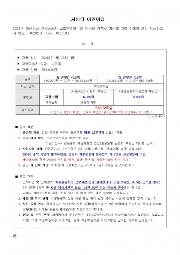 2026년 1월 어린이집 차량동승자 보조인력 임금 지급 안내_사임당