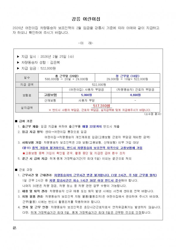 2026년 2월 어린이집 차량동승자 보조인력 임금 지급 안내_강릉