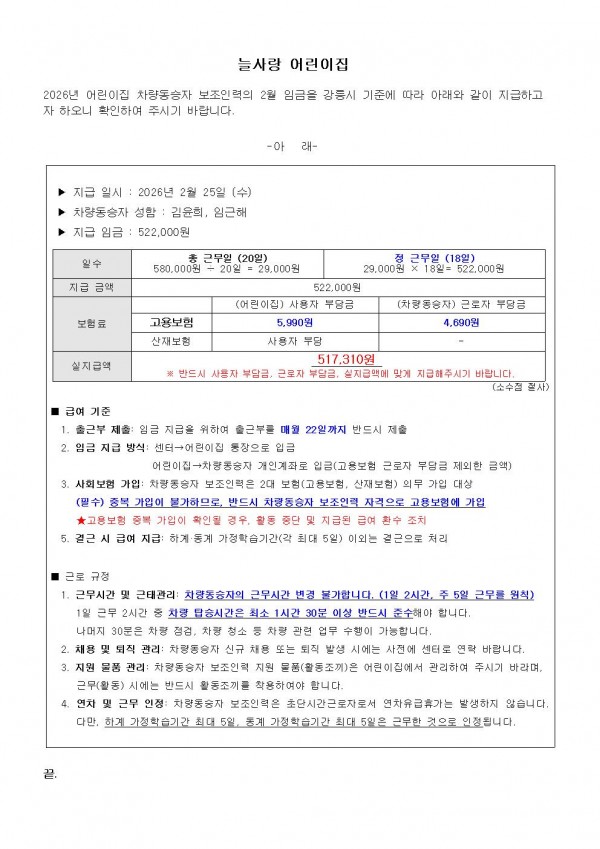 2026년 2월 어린이집 차량동승자 보조인력 임금 지급 안내_늘사랑