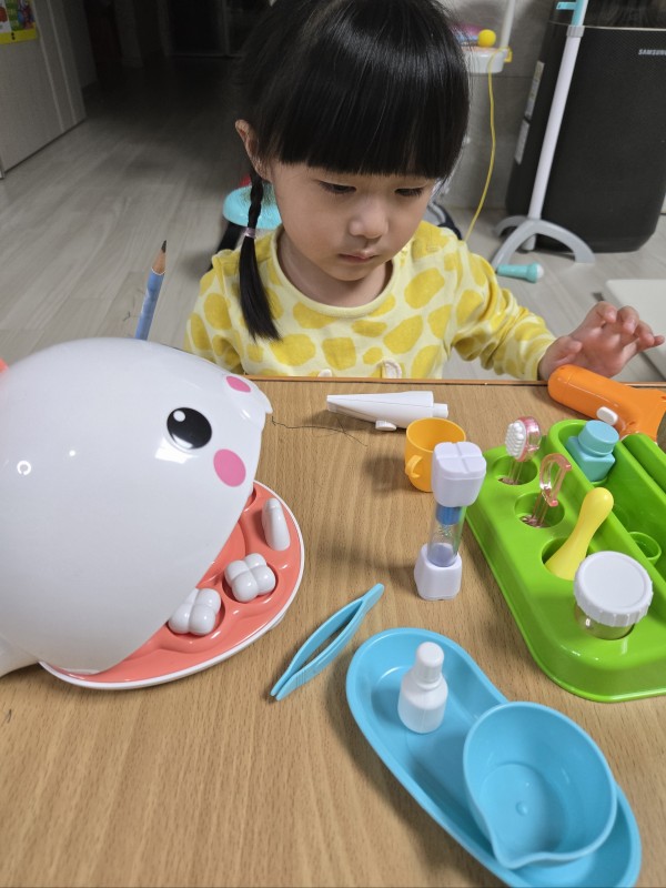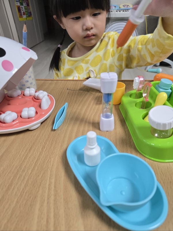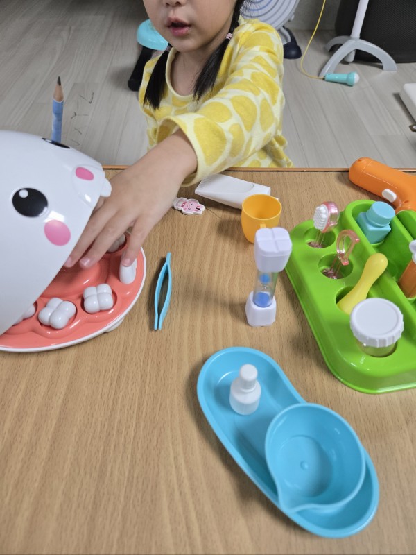 토끼 동물병원 양치놀이 진료키트의 다양한 구성품에 놀랐습니다. 오빠와 동생의 교감이 많이 생겼으며 서로가 치과의사와 환자가 되어보는 역할놀이에도 집중하며 즐겁게 노는 모습이 그려졌습니다.